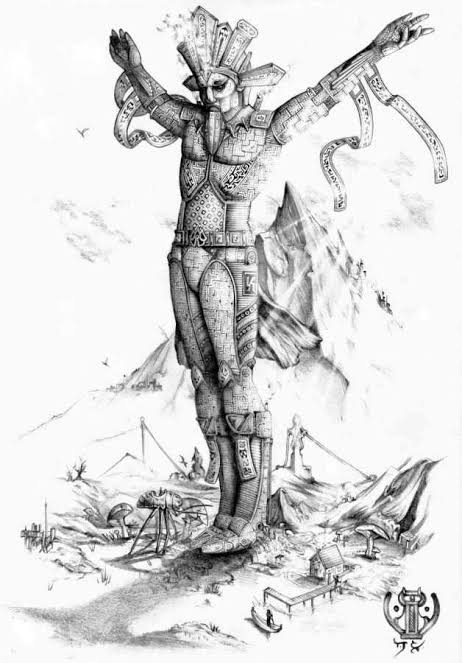 In the Elder Scrolls 2: Daggerfall, the player is tasked with finding a component to activate an massive automaton (Numidium) which was built by a civilization that no longer exists (Dwemer). The automaton has the power to reshape the world politically. There are several powerful individuals or factions that want the component to use for their own ends or to activate the automaton. The activation of the Numidium ends the game.